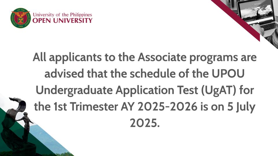 Associate in Arts Program UgAT Advisory News and Announcements superadmin2025-11-07T07:29:03+00:00MPM Graduate Admission Test Schedule Updatesuperadmin2025-11-07T07:29:03+00:00November 7th, 2025|superadmin2025-09-09T03:15:26+00:00Registration Periodsuperadmin2025-09-09T03:15:26+00:00September 9th, 2025|superadmin2024-04-08T03:25:29+00:00[Advisory] Regular Holiday: April 9 and 10, 2024.superadmin2024-04-08T03:25:29+00:00April 8th, 2024|superadmin2023-08-17T05:55:21+00:00UPOU AIMS Portal Maintenancesuperadmin2023-08-17T05:55:21+00:00August 17th, 2023| superadmin2025-05-13T00:58:03+00:00